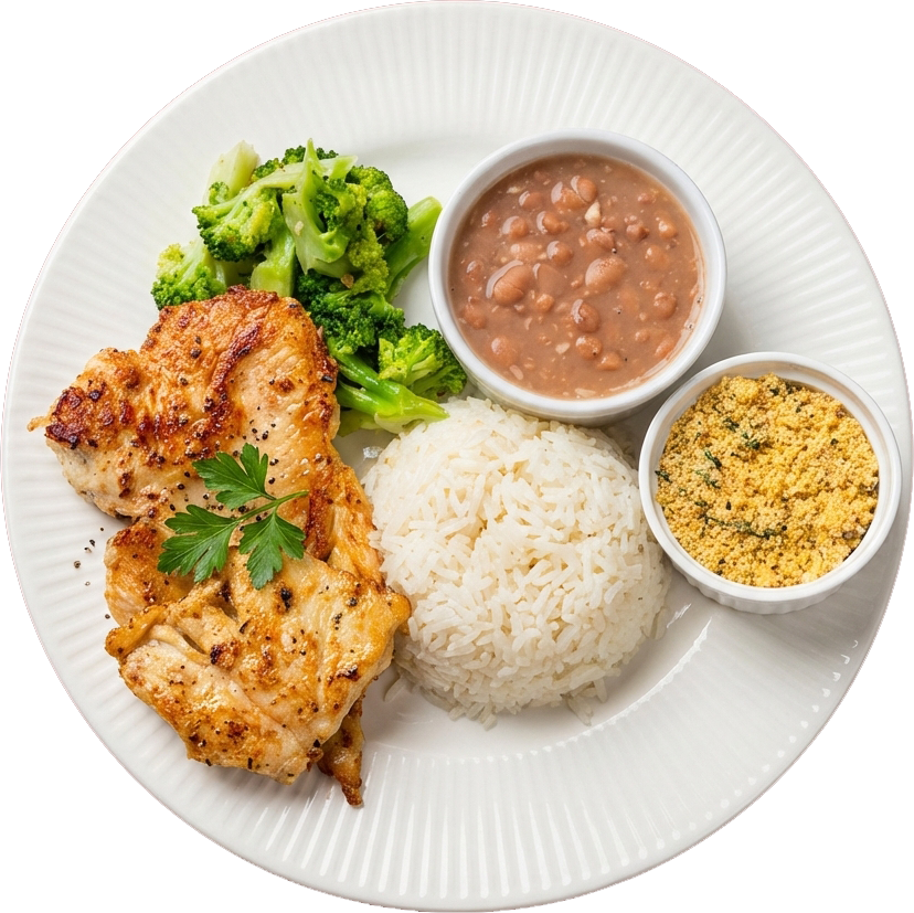 Todos os pratos, com exceção de algumas opções do ‘Prato do Dia’, são acompanhados por: arroz, feijão, legumes ou fritas, farofa e salada de entrada.